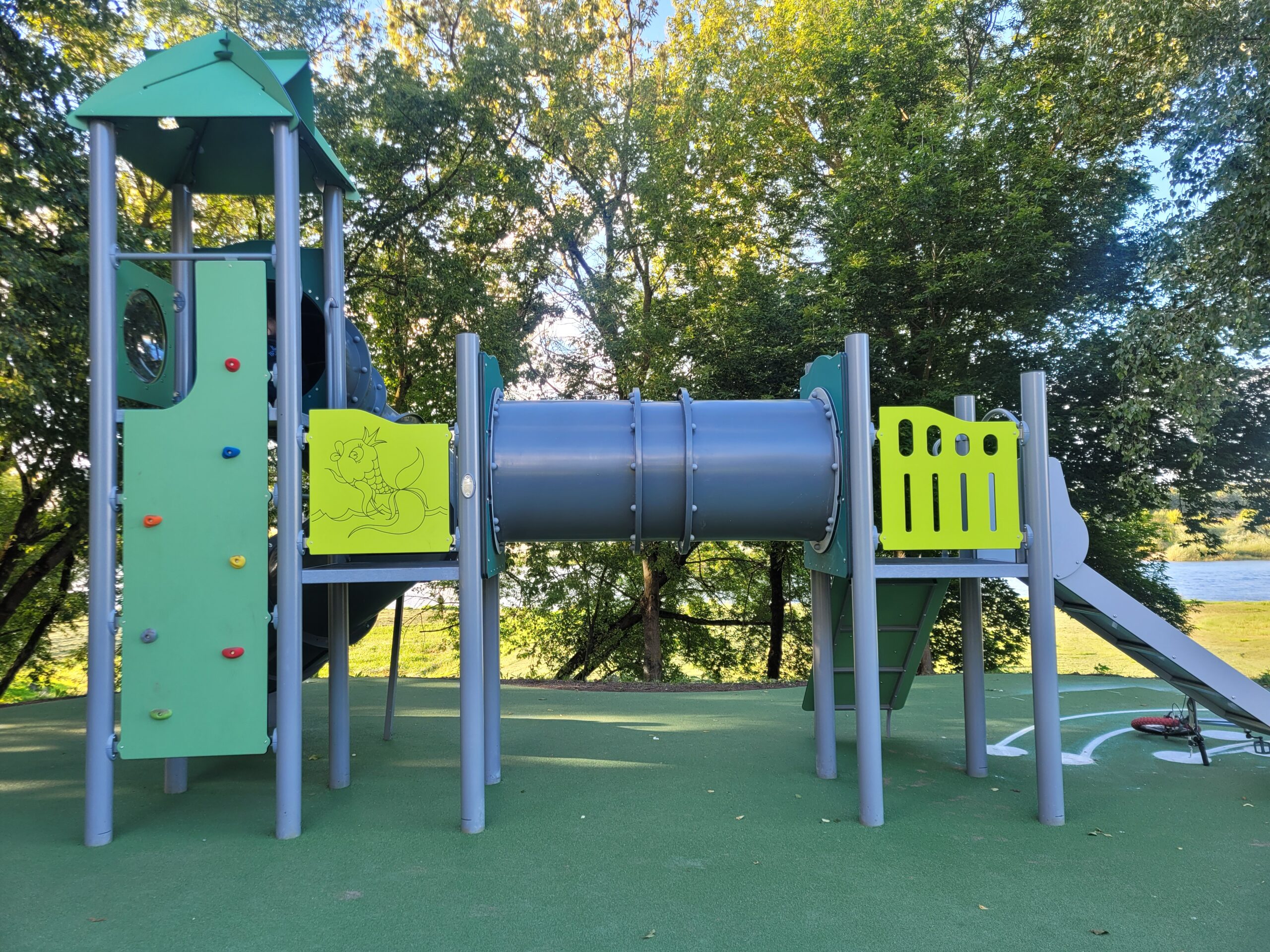 Paėjus kiek toliau, prie stadiono, yra dar viena aikštelė – gerokai įdomesnė. Ji suskirstyta į dvi zonas: vienoje – tradicinės pramogos vaikams, o kitoje – didelė tinklinė „Piton“ laipynė, kuri primena ilgą ruožą ar tiltą. Vaikai laipioja, balansuoja, ir kai įveikia visą trasą, jų laukia smagi pabaiga – nučiuožimas nuo išskirtinės dangos čiuožyklos.