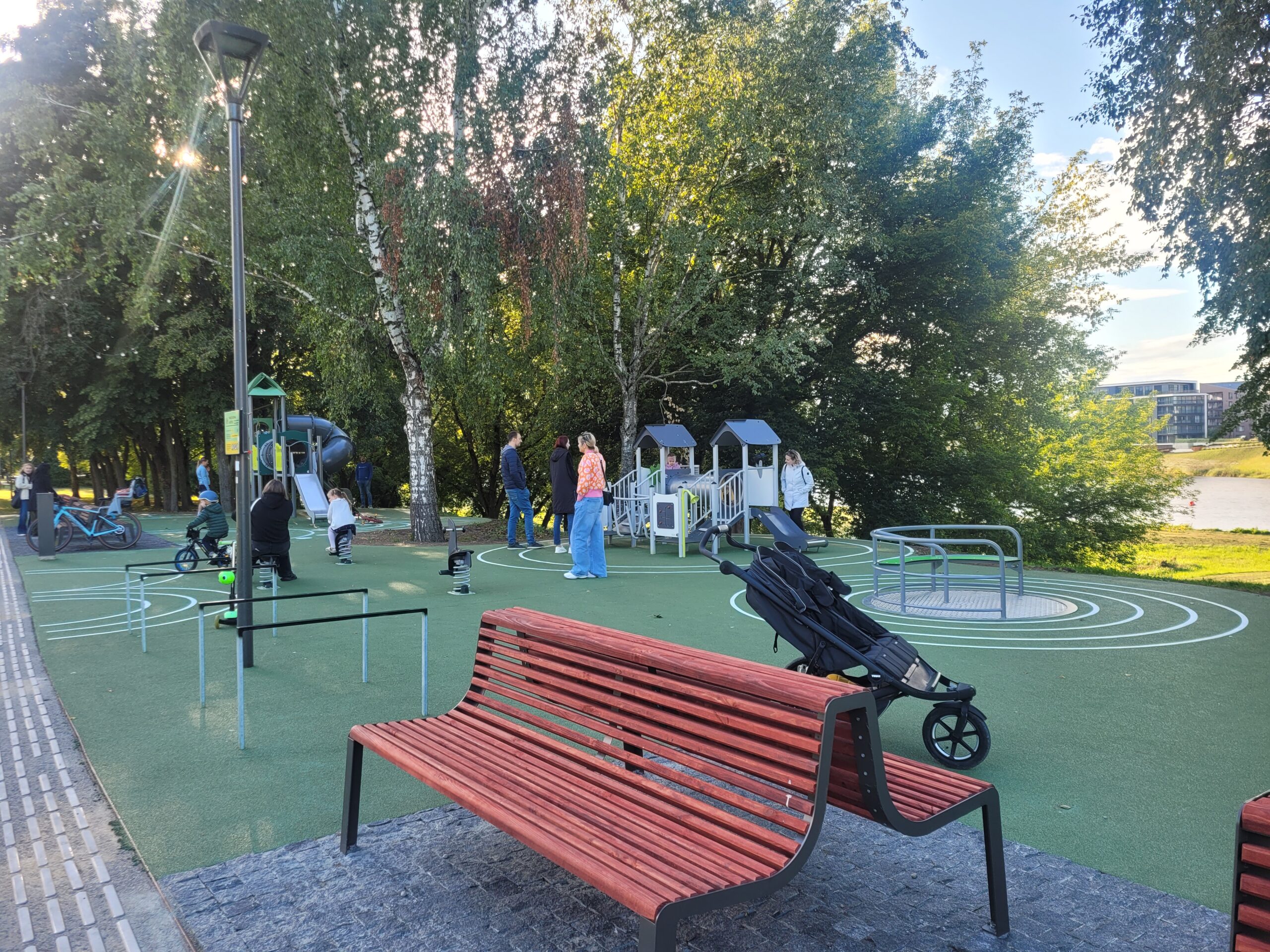 Vaikų laukia naujos sūpynės, čiuožyklos, laipynės, tvarkinga ir saugi aplinka pačiame Neries pakraštyje.