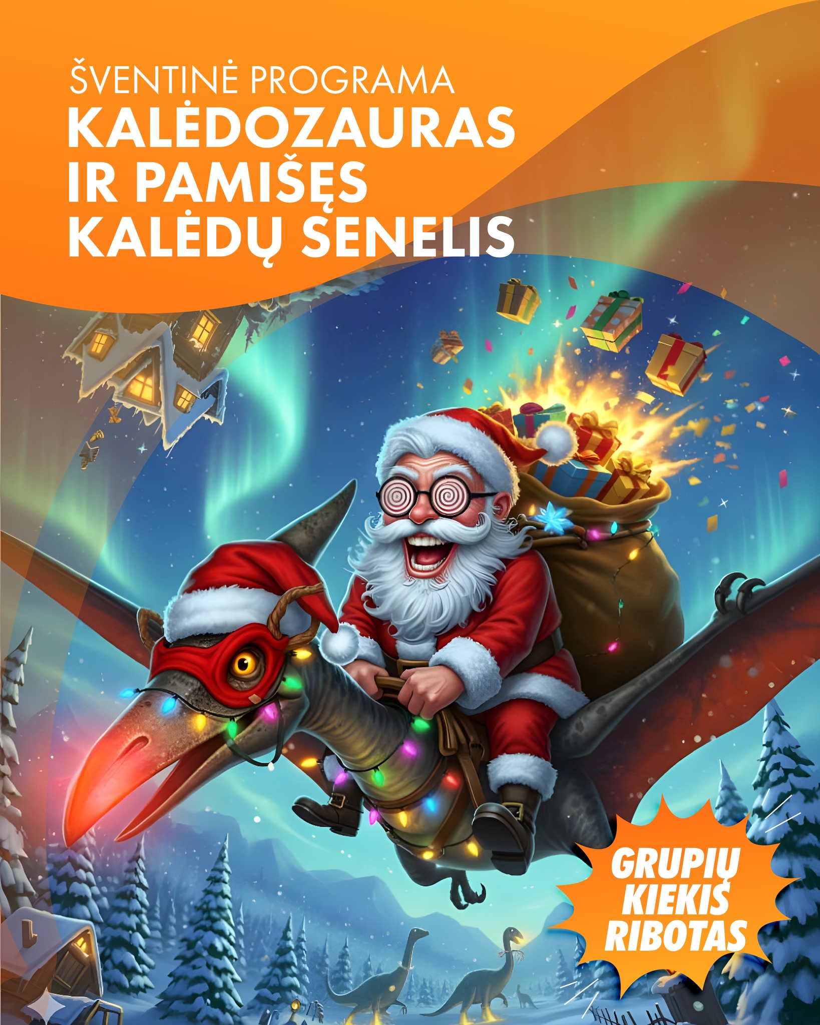 Šventiniu laikotarpiu net ir dinozaurai pasipuošia Kalėdų nuotaika! Laukia ne tik nuotaikinga šventinė programa, pilna nuotykių, žaidimų ir netikėtumų, bet ir Kalėdinės edukacjos vaikams.