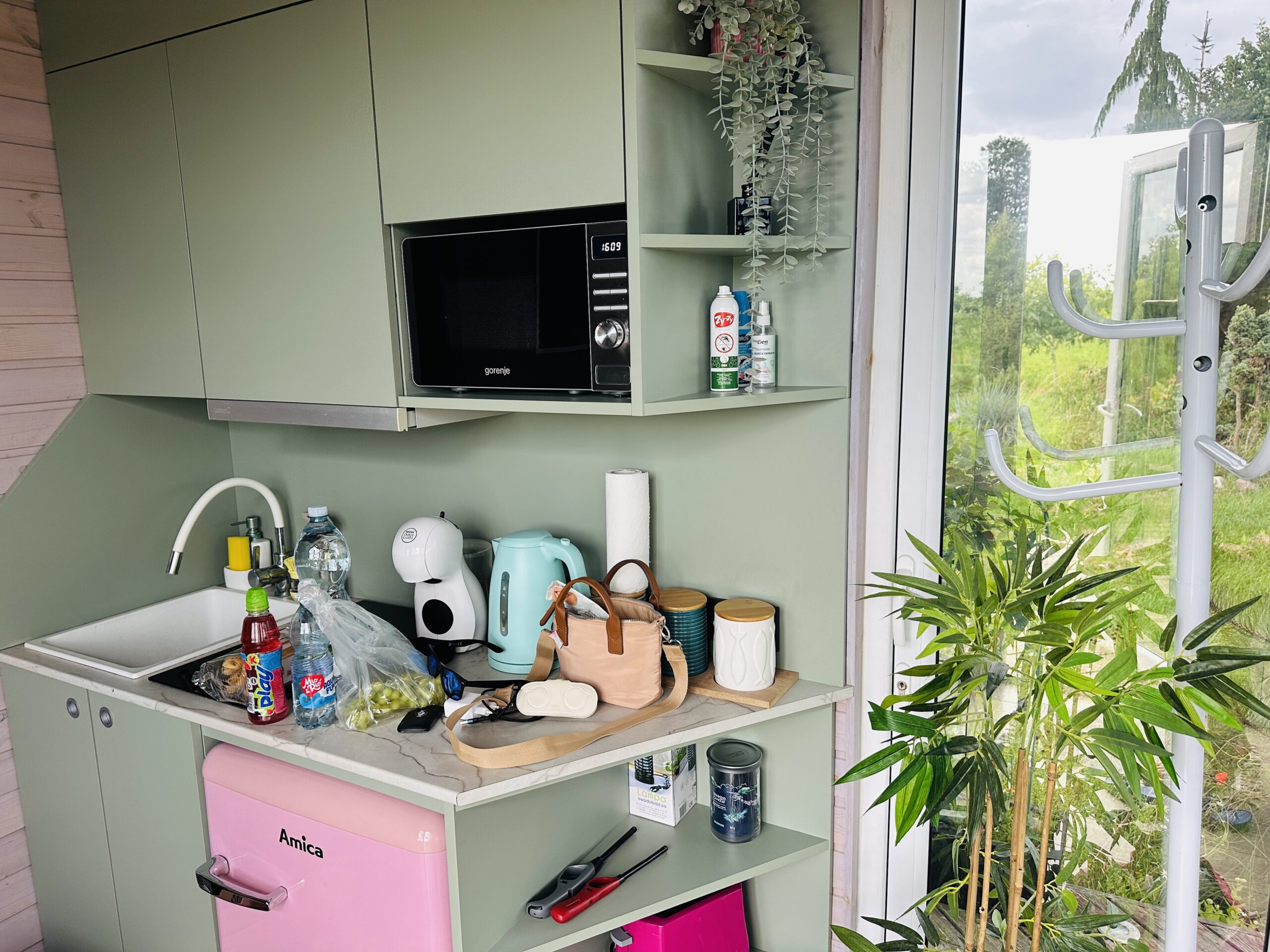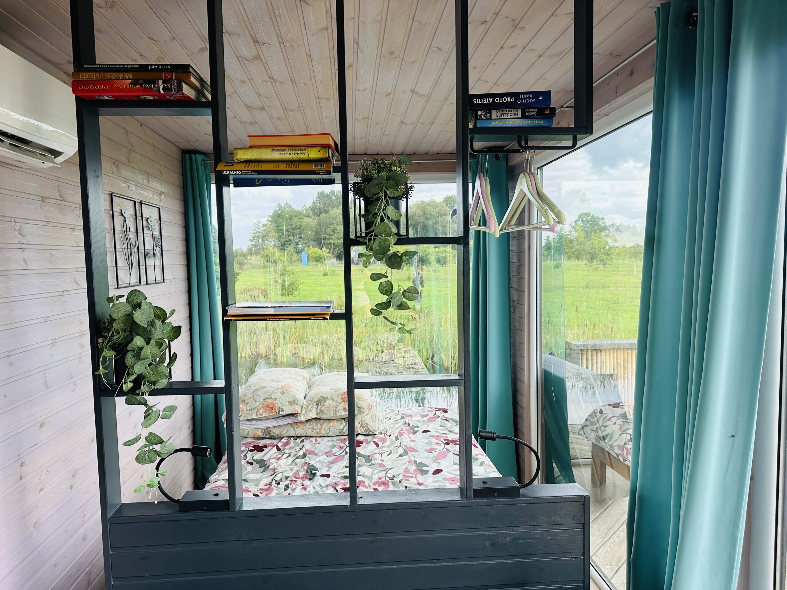 Šios nuostabios vietos šeimininkė pasakojo mums, kad prieš 8 metus plyname lauke išsikasė prūdą o prieš 6 metus pastatė pirmąjį konteinerį poilsiui sau. Ir tuomet visiškai neturėjo minčių puoselėti kaimo turizmo ar nuomoti šios vietos. Kaip ir daugelis žmonių karantino metu sugalvojom praplėsti prūdą ir pastatyti antrą namelį savo vaikams, draugams, o tada, gal ir nuomai. Pirmi klientai gyvenę namelyje tris mėnesius, buvo ukrainiečių šeima, karo pabėgėliai. 18 kv.metrų patalpoje. Čia jie tilpo keturiese kartu su mažu šuniuku. “Jiems išvykus pabandėme nuomoti namelį, likome maloniai nustebinti, kad žmonės tiesiog pradėjo važiuoti, grįžti tie patys, rekomenduoti draugams” – pasakoja šeimininkė.
