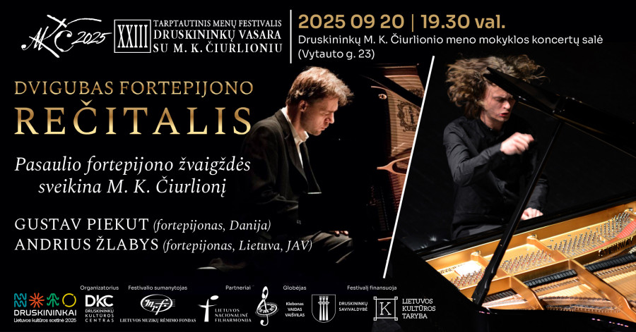 Rugsėjo 20 d. 19:30 val. Druskininkų M. K. Čiurlionio meno mokyklos koncertų salėje vyks dvigubas fortepijono rečitalis, kuriame pasirodys pasaulinio garso pianistai Gustav Piekut (Danija) ir Andrius Žlabys (Lietuva, JAV). Tai išskirtinis vakaras, skirtas pagerbti M. K. Čiurlionio 150-ąsias gimimo metines.