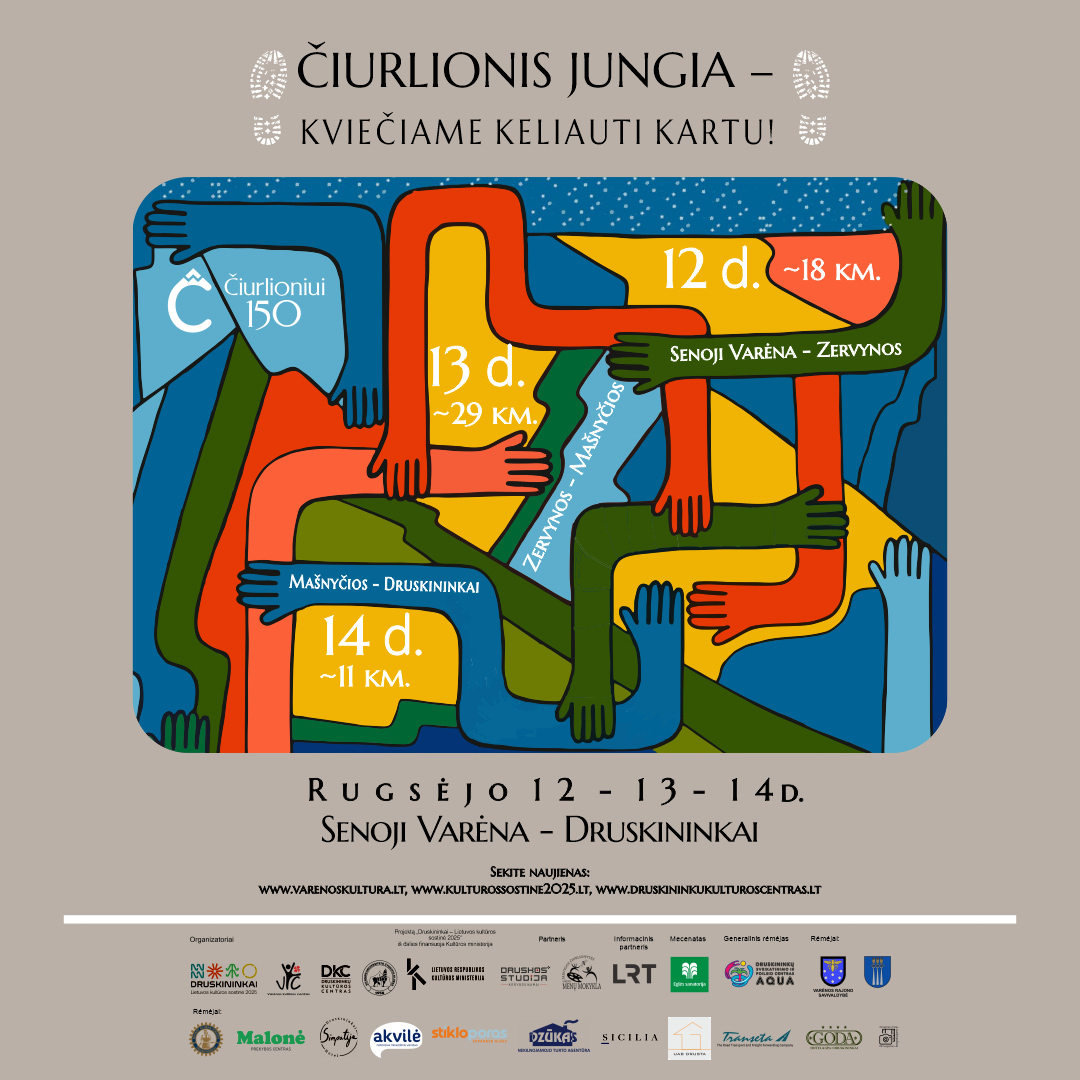 - Rugsėjo 12 d. Senoji Varėna – Zervynos. Pradžia 14:00 val. Po žygio – vakaro programa „Toji versmė Čiurlioniui buvo liaudies dainos“ su etnomuzikologe dr. Loreta Sungailiene, menotyrininke Aušra Česnulevičiene ir folkloro ansambliais.