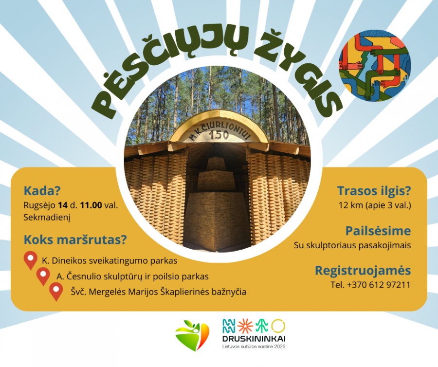 Rugsėjo 14 d. kviečiama į pėsčiųjų žygį, skirtą M. K. Čiurlionio 150-osioms gimimo metinėms. Žygis prasidės nuo K. Dineikos parko ir ves link A. Česnulio skulptūrų parko.