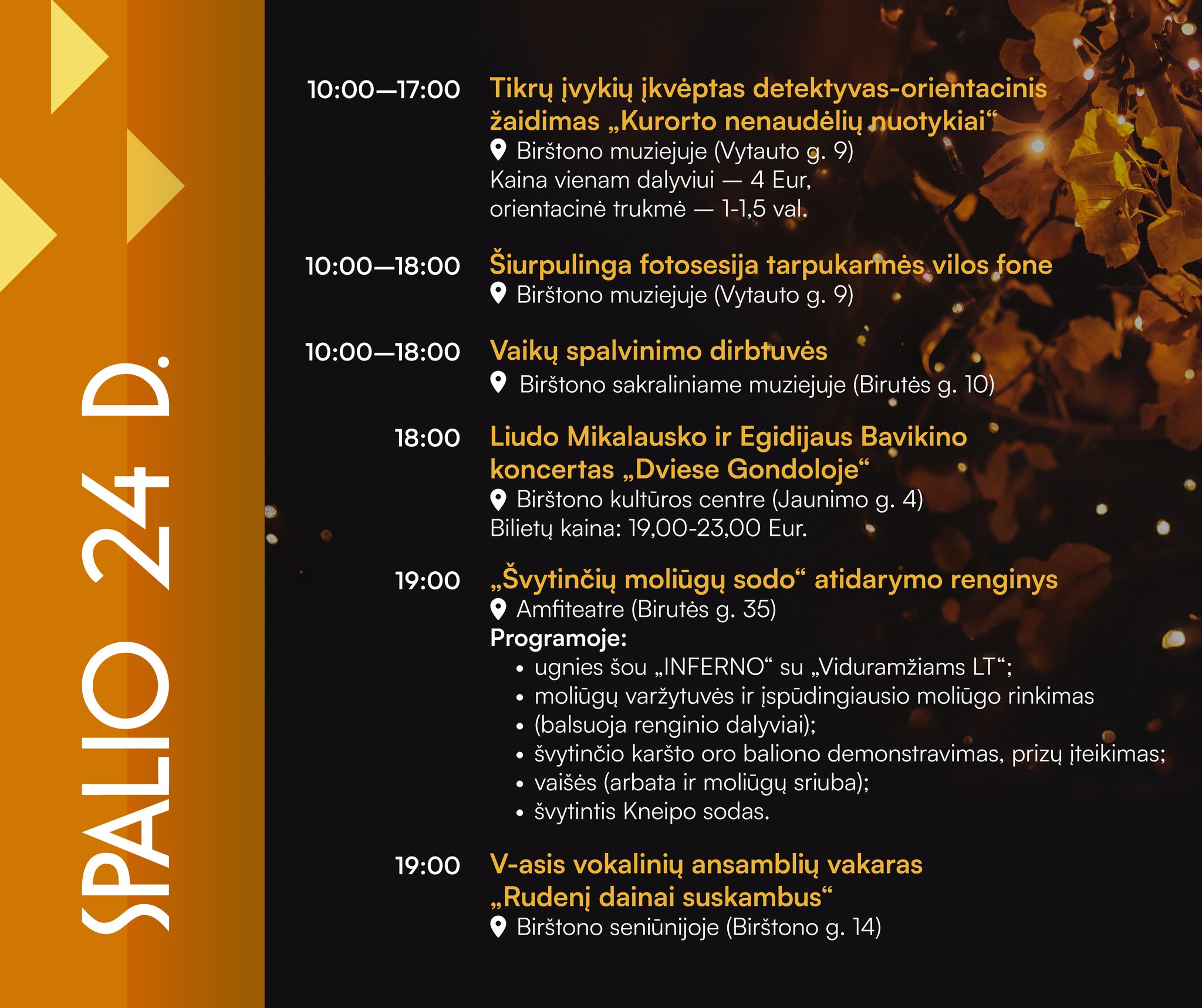• 10:00-17:00 val. Tikrų įvykių įkvėptas detektyvas-orientacinis žaidimas „Kurorto nenaudėlių nuotykiai“ Birštono muziejuje (Vytauto g. 9). Kaina vienam dalyviui – 4 Eur, orientacinė trukmė – 1-1,5 val.