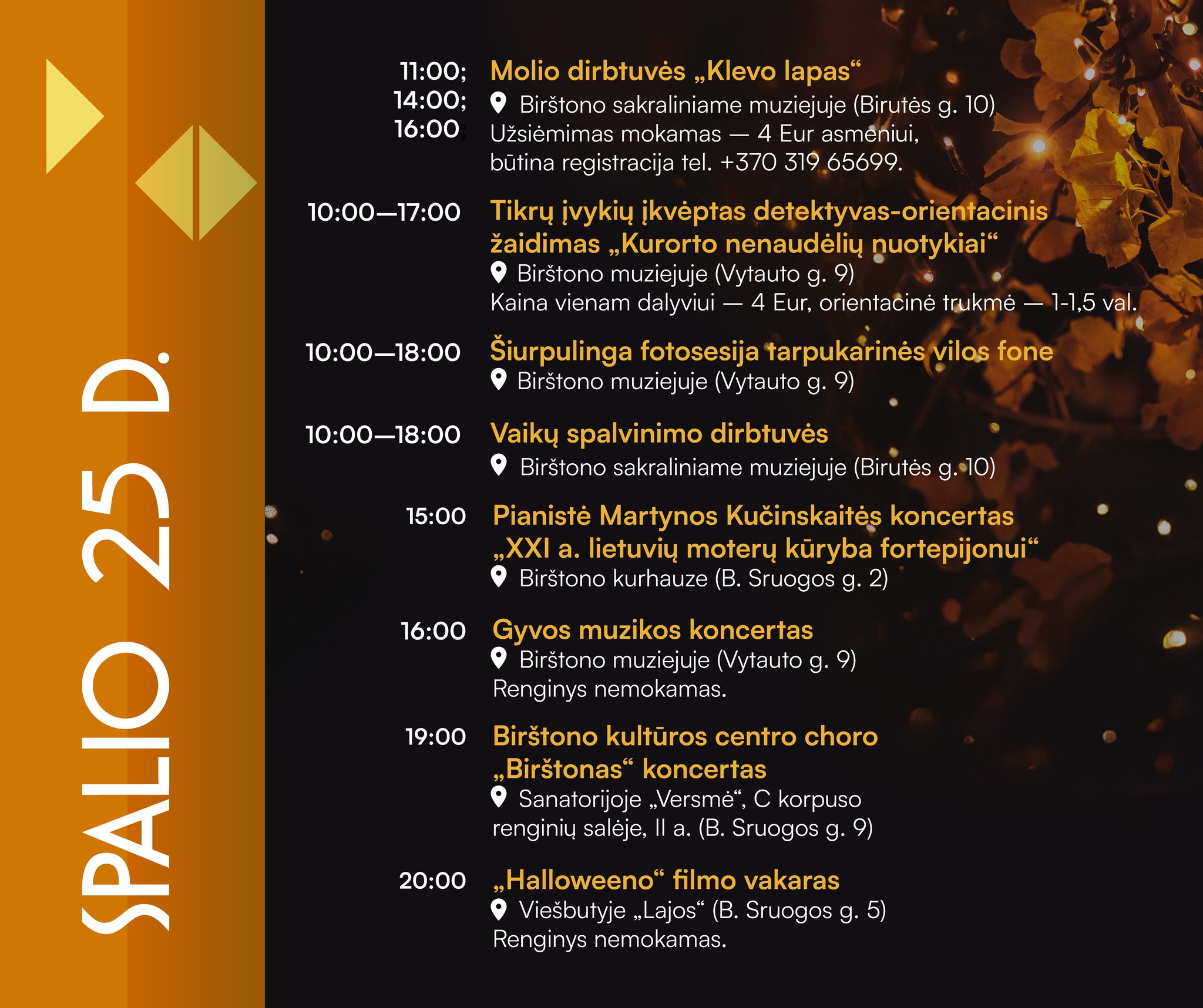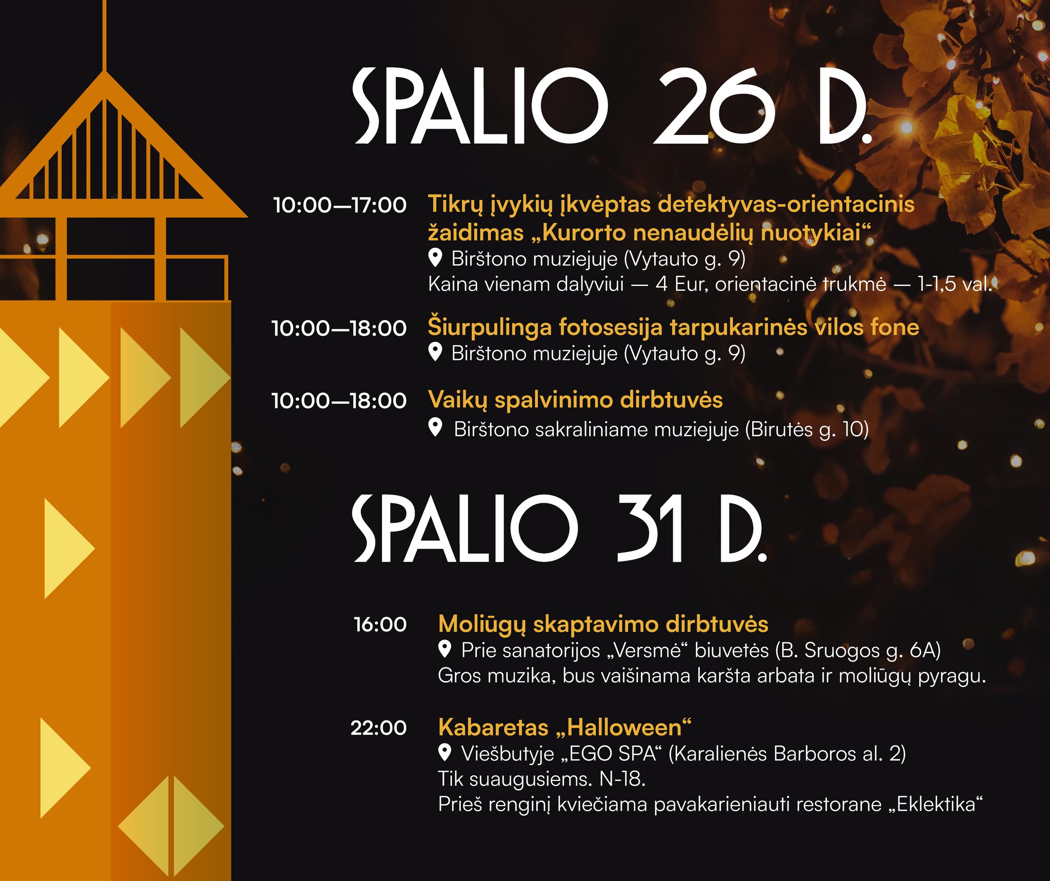 Penktadienį prasidės ir Birštono muziejaus inicijuojami šventinio laikotarpio renginiai: šiurpulinga fotosesija tarpukarinės vilos fone, tikrų įvykių įkvėptas detektyvas–orientacinis žaidimas „Kurorto nenaudėlių nuotykiai“, spalvinimo dirbtuvės vaikams bei molio dirbtuvės „Klevo lapas“ Birštono sakraliniame muziejuje. Juose bus galima sudalyvauti ir spalio 25 bei 26 dienomis.