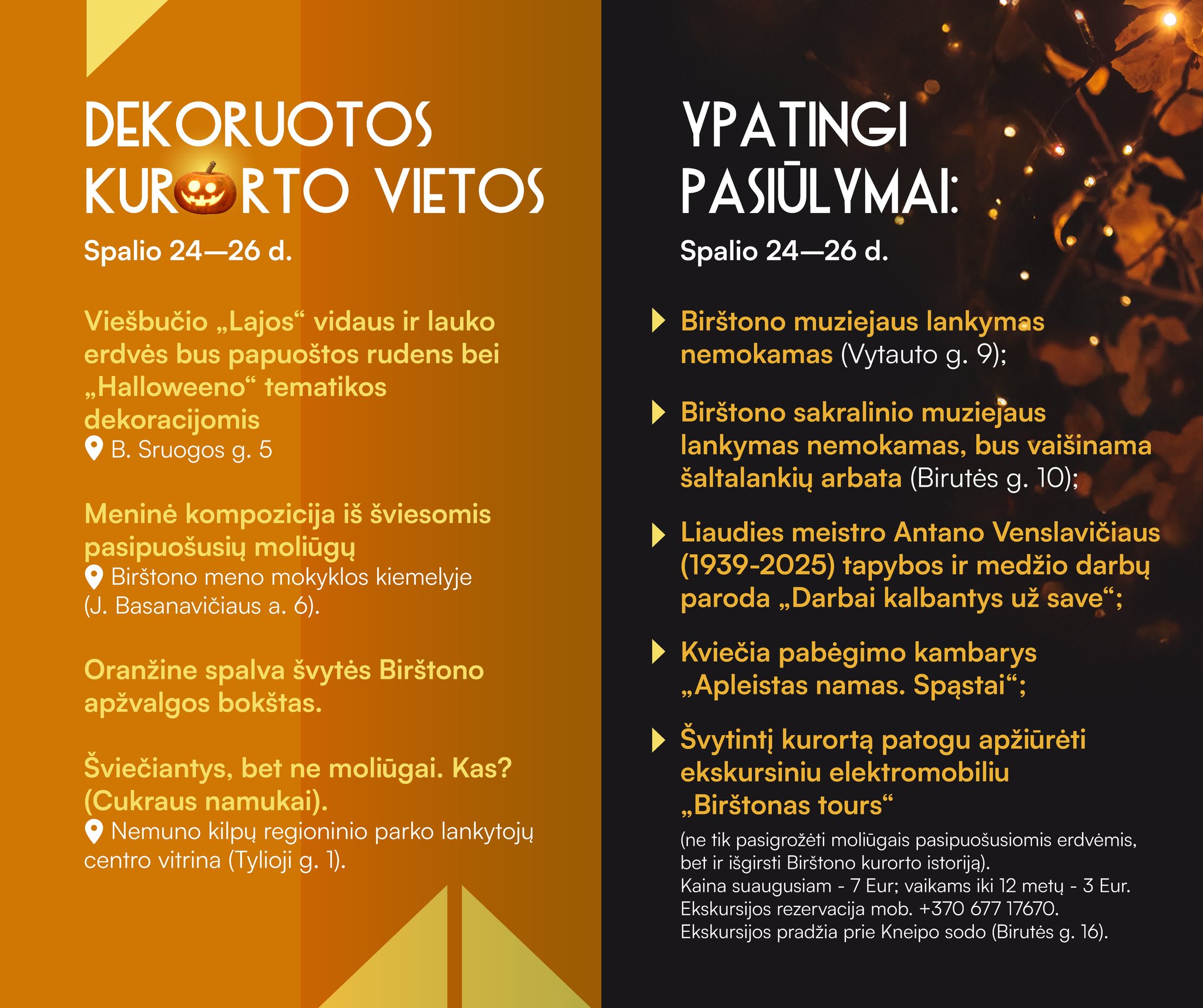 Rudenėjantį Birštoną apgaubs paslaptinga atmosfera ir šilta oranžinė spalva. Čia iki pat Vėlinių laukia teminiai renginiai, koncertai, švytinčių moliūgų instaliacijos ir jų skaptavimo dirbtuvės, Šiurpnakčio šiurpuliukai bei kulinariniai atradimai.