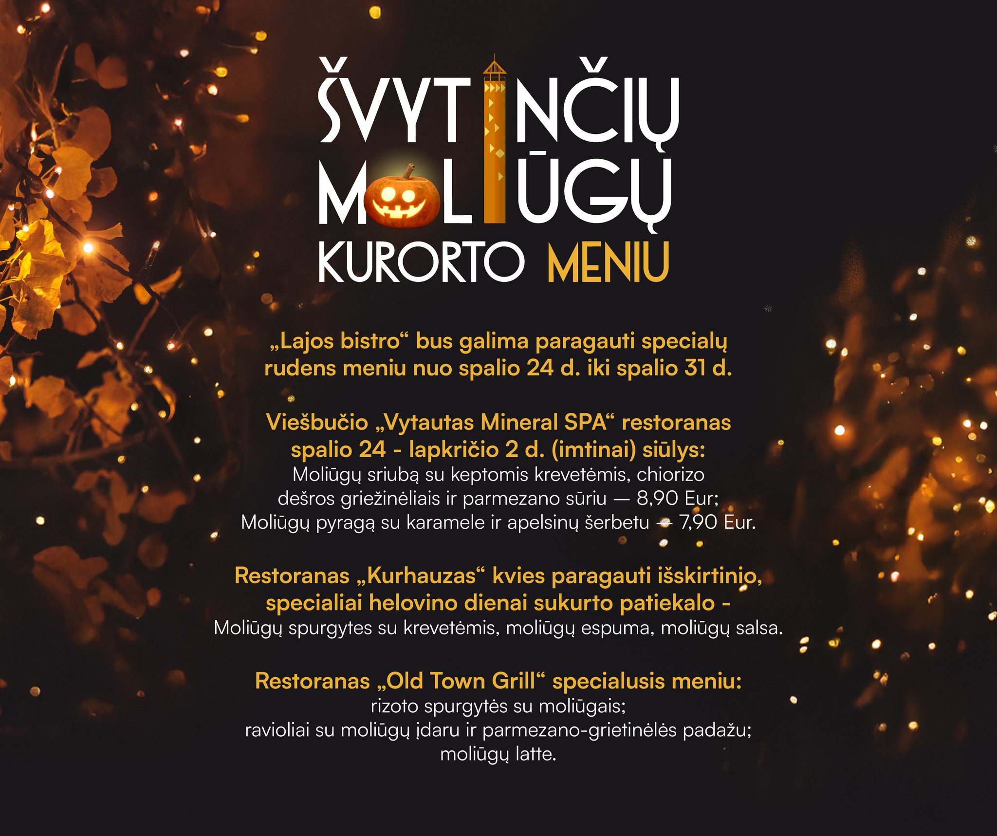 • Spalio 24 – lapkričio 2 d. (imtinai) Viešbučio „Vytautas Mineral SPA“ restoranas siūlys: Moliūgų sriubą su keptomis krevetėmis, chiorizo dešros griežinėliais ir parmezano sūriu – 8,90 Eur; Moliūgų pyragą su karamele ir apelsinų šerbetu – 7,90 Eur.